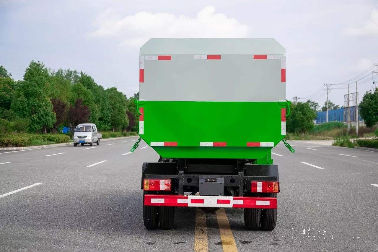 自動舉升垃圾桶倒入垃圾,提升機頂部帶機械翻蓋,箱體底部雙液壓舉升自卸,箱體后部設有擋水槽,尾部裝有橡膠密封條,防污水滴漏。